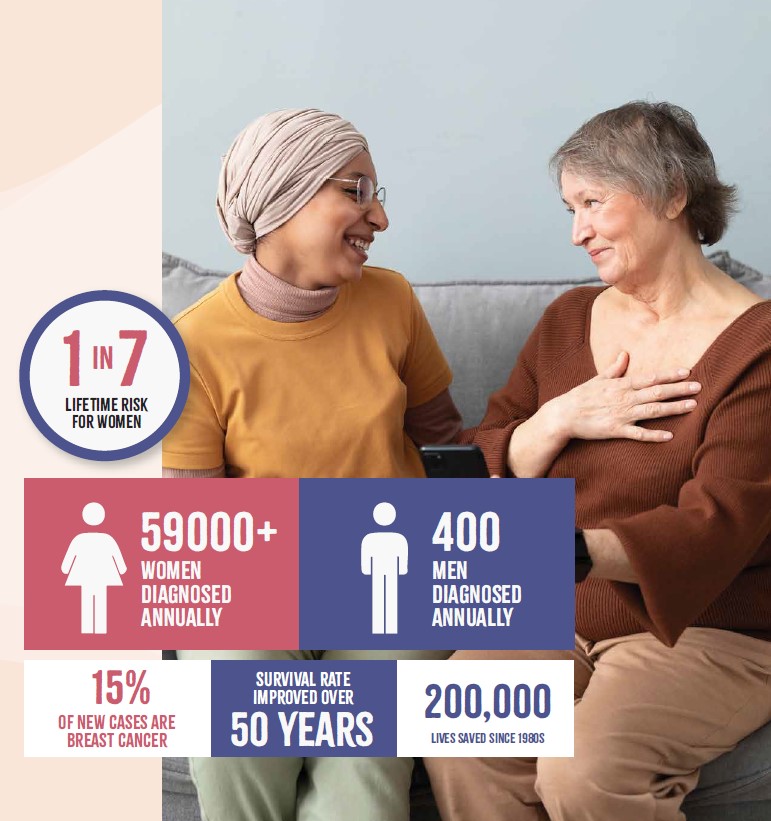 Breast cancer remains one of the most common cancers in the UK with around 56,000 people diagnosed each year – that’s one person every 10 minutes! While survival rates have improved thanks to advances in early detection and treatment, breast cancer can affect anyone, regardless of gender, age, or background. Around 1% of cases occur in men, and there is a concerning rise in diagnoses among younger women.